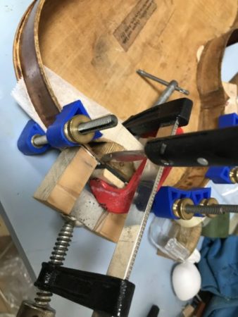 駒が万が一倒れた場合に楽器にキズが付くのを防ぐためにカバーを行います。薄い布やティッシュ、梱包材(プチプチ)などを巻き付けてください。固定するためにマスキングテープやセロハンテープを使用しても大丈夫です。ガムテープやビニールテープを使用する場合は楽器本体に付着しないように注意してください。