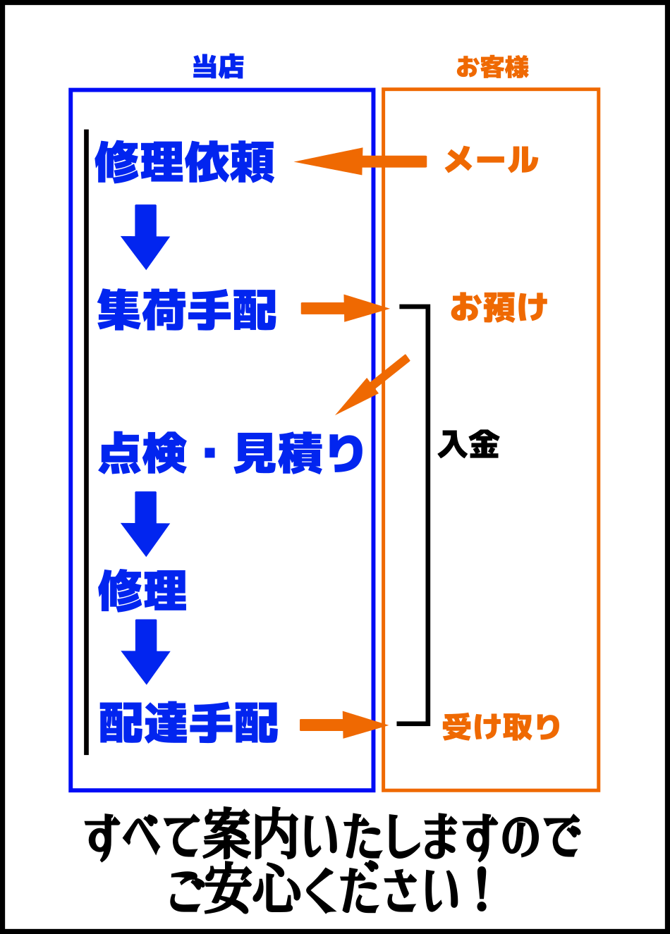 修理金額や期間につきましてはお預かりした時点で点検・見積もりを行い提示させていただき、ご同意の上で作業を開始いたします。※配送修理の場合は往復送料が別途かかりますのでご了承ください。
