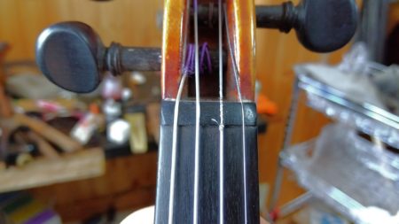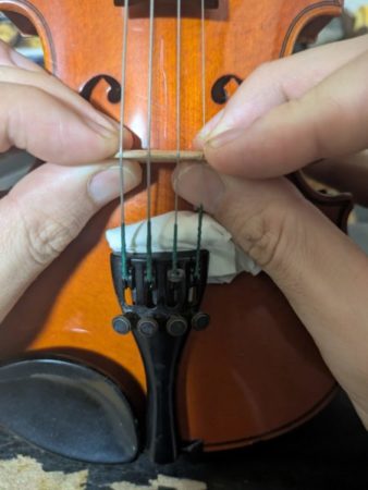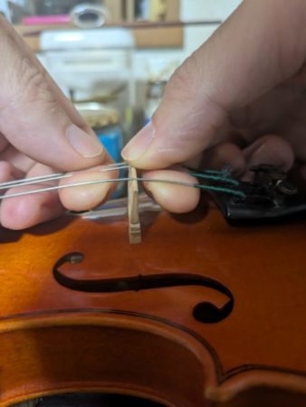 バイオリンを始めとする弦楽器(ビオラ・チェロ・コントラバス)では駒がネック側に傾いていくことがよく起こります。バイオリンをあたらしく始められた方が調整に来られた際に駒が傾いている。ご本人も気付いているがどうすればいいのかはわからないといったことがよくあります。